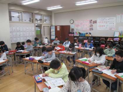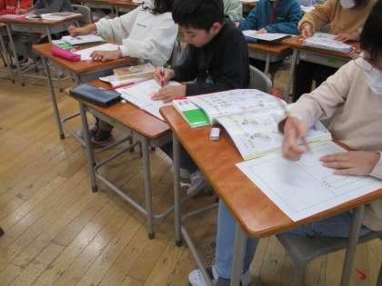 国語科「馬のおもちゃの作り方」で学んだ、分かりやすく説明する工夫を使って、生活科で作っているおもちゃの作り方を書いています。教科書を見たり、実際に作ってみて感じたことを生かしたりして、まとめています。