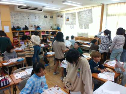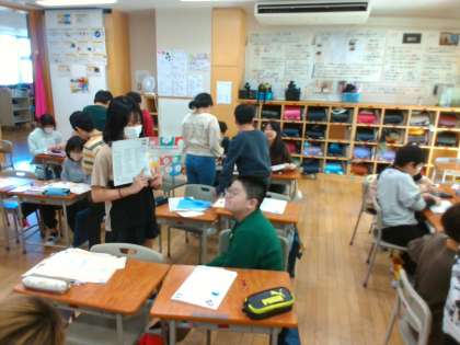 「What would you like?」「I'd like 〜」の文を用いて、店員と客に分かれて食べたいものの注文をしました。みんな楽しみながら取り組んでいました。