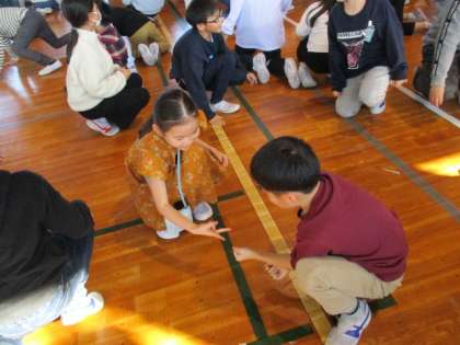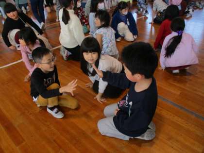 次に、集会委員会から「進化ゲーム」という遊びを教えてもらい、2、3年生で交流しながら楽しんでいました。この交流をきっかけに、他学年との仲も深めてほしいなと思います。