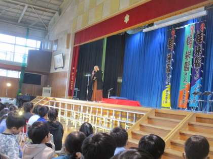 今日は、落語家の桂米福さんをお招きし、落語について教えていただいたり、実際に落語を見たりしました。テレビでは見たことがあっても、目の前で落語を聞くのは初めてという子供も多く、落語家の方の話し方や洒落の効いた言葉を聞いて楽しんでいました。