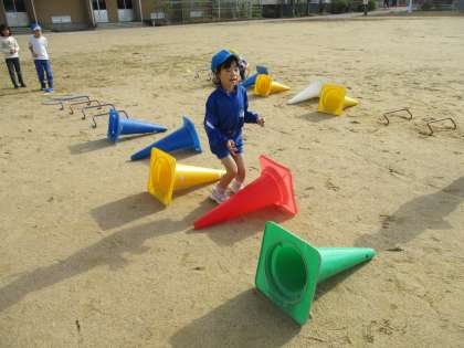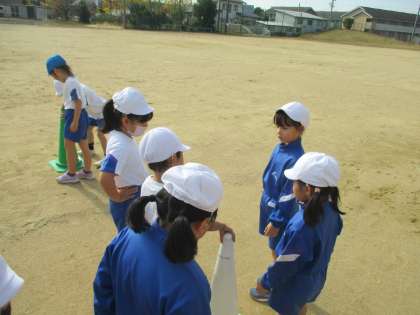 体育の学習では、ハードルやフープなどの障害物を越えながら、走る運動あそびを続けてきました。今は、団で相談してオリジナルのコースを作っています。繰り返しコースを作るうちに、「ハードルの向きを変えて、ジグザグ越えるようにすると楽しいコースになりそう」「コーンの横に倒して、それを跳び越えるコースを作ったら面白そう」など、いろいろな発想が出てきました。また、他の団のコースもやってみたことで、友達のコースのよさや面白さにも気付いたようです。頭も体も働かせている姿がとっても素敵でした!