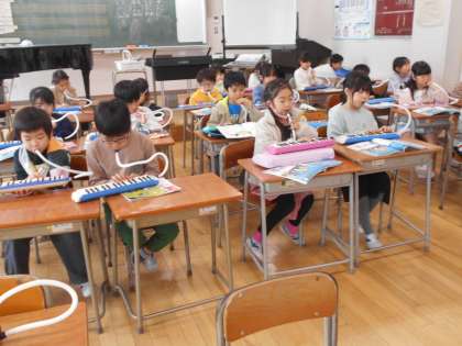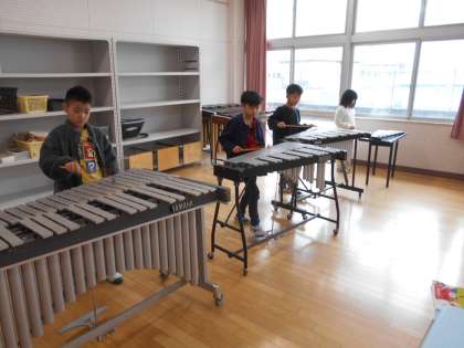鍵盤ハーモニカと鉄琴でパートに分かれて、きらきら星を演奏しました。鉄琴パートは、初めての頃は緊張しながらぎこちなくたたいていましたが、少しずつ慣れてきました。鍵盤ハーモニカパートは、タンギングに気を付けてなめらかに演奏できるようになってきました。