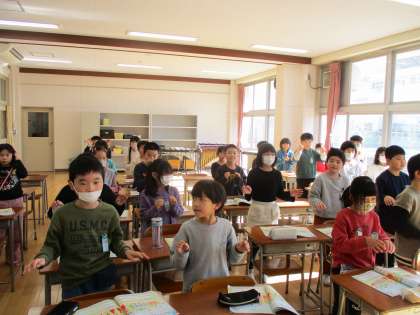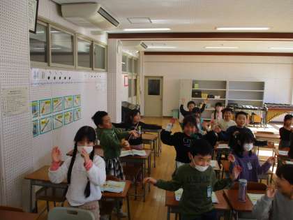 「トルコ行進曲」を聴き、同じような旋律が繰り返されながら曲が進んでいく面白さを感じ取りました。また、音の強弱から軍楽隊が近付いたり、遠く離れていったりする様子を想像しました。強弱を腕の振りで表現し、楽しみながら鑑賞しました。