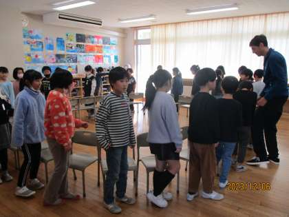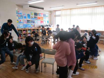 今日のふじっ子タイムで、いす取りゲームをしました。惜しくもいすに座れなかった子たちは、周りでダンスをして応援していました。勝ち進んだ子もそうでない子も楽しみました。