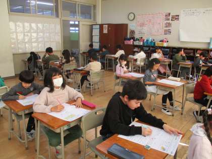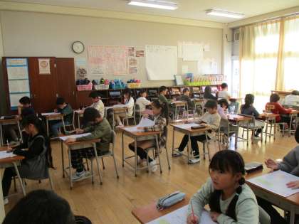 2学期の学習もまとめの時期を迎え、算数科「かけ算」の学習も終わりに近付きました。今日は、六の段から九の段の九九を使って解くテストをしました。覚えた九九を思い出しながら最後まで丁寧に答えを書いていました。