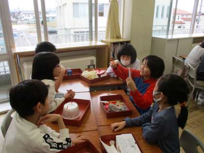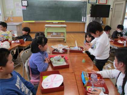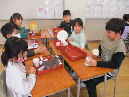 生活科「うごくおもちゃをつくってあそぼう」の学習で作ったおもちゃを、何度も改良したり、数を増やしたりして、みんなが楽しめるように工夫しました。今日は、班ごとに出来上がった自分のおもちゃを紹介しました。「よくとびます」「この模様がポイントです」など、おすすめポイントを伝え合いました。