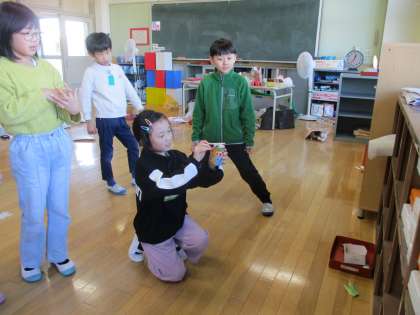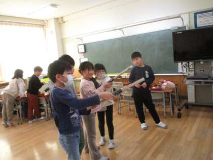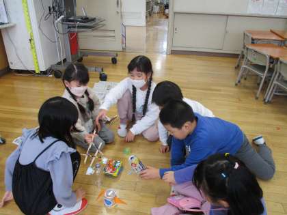つくったおもちゃで班の人と遊びました。友達のおもちゃの面白さに夢中なり、時間を忘れて楽しみました。自分のおもちゃにはない工夫を見付けて、「すごいね!」「最高!」等の声が上がっていました。