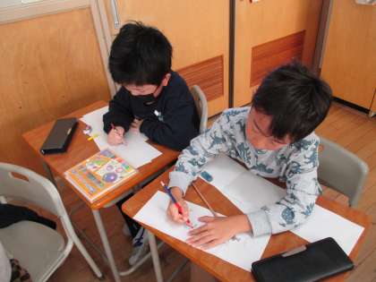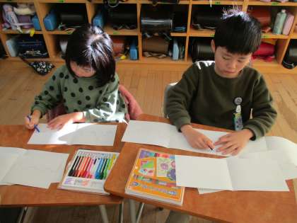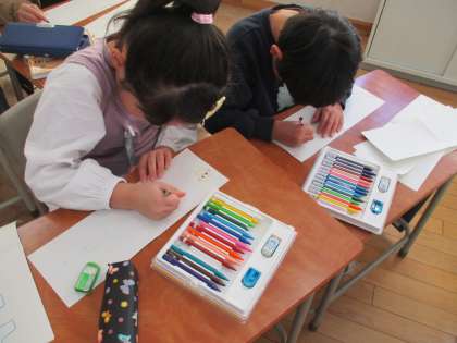 図画工作科の学習では、「せんのぼうけん」という題材で、紙に線を描き、そこから広がる物語を想像しながら絵を描く活動を進めています。くねくねの線やギザギザの線等、いろんな線を描きながら想像を膨らませていました。