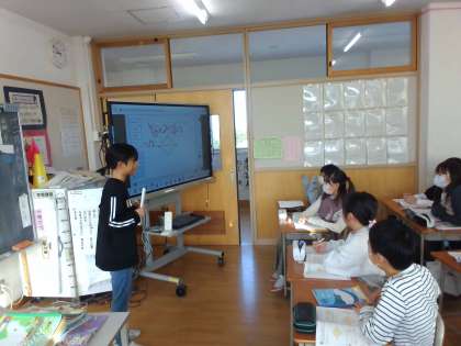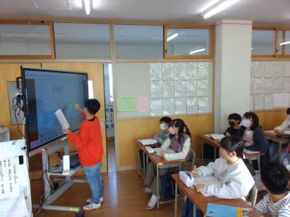 ひし形の面積の求め方を考えました。自分なりの方法をみんなに紹介することができました。