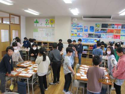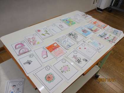 総合的な学習の時間に調べたことや分かったことを郷土かるたにしました。一人一人が一文字ずつ担当し、読み札と絵札を作りました。そのかるたを使って、今日は教室のみんなでかるた大会をしました。とても盛り上がりました。