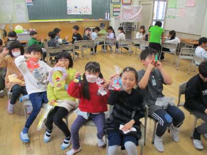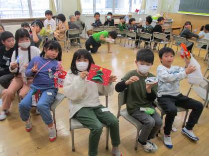 最後に手作りクリスマスプレゼント交換をしました。クリスマスツリーが飛び出るカードや、折り紙で折ったトナカイ等、アイディアがつまったプレゼントに大喜びでした。
