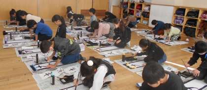 始業式後の校内書初め大会では、毛筆で「友だち」を書きました。