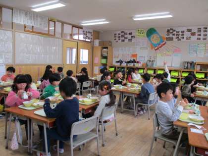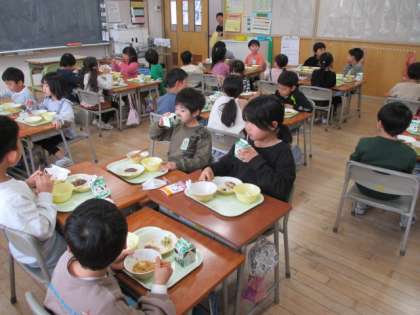 今日から3学期の給食が始まりました。グループになって楽しくおいしくいただきました。