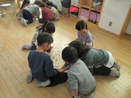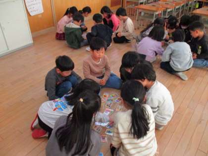学級活動の時間にかるたで仲良く遊びました。かるたの文字や絵をよく見て、素早くかるたを取ろうととても集中していました。