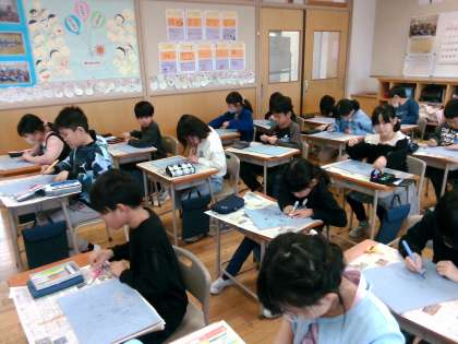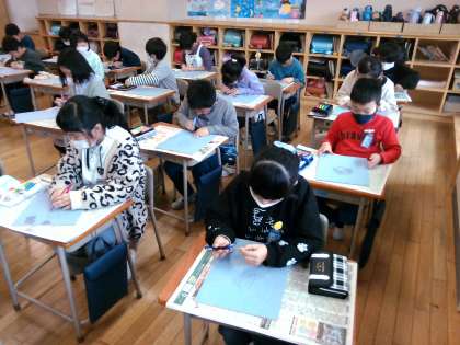 図画工作科の時間に、版画の作成に取りかかりました。初めて彫刻刀を使っての作品づくりです。正しい使い方を学習した後、慎重に彫り始めていました。