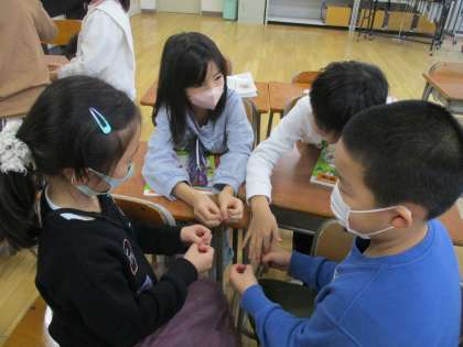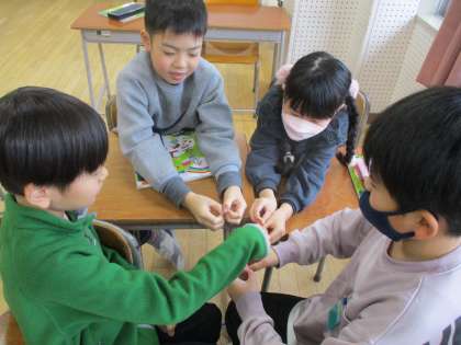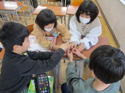 童歌「ずいずい ずっころばし」で手遊びをしました。歌に合わせて、最後の「だあれ」で鬼の指をつかまえた人から抜けていく遊びを初めてした子どもも多く、楽しみながら童歌に親しみました。