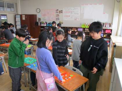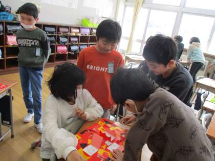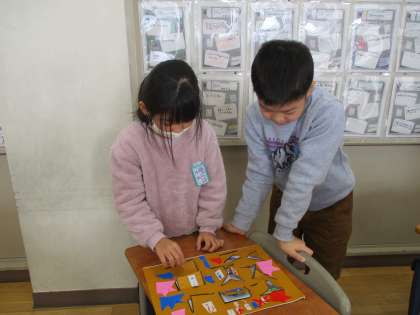 図画工作科でつくった「まどからこんにちは」を使って、絵合わせ遊びをしました。友達の作品の窓を開いて、同じ絵柄を探し、当てたときには大喜びしていました。