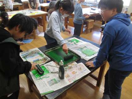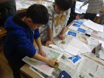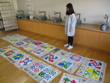 色版画を刷りました。4色を組み合わせ、思い思いの模様を表現しました。