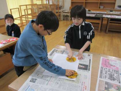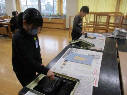 図画工作科で取り組んでいる木版画の版ができあがり、今日は刷りました。ローラーでインクを付け、ばれんでこすって、上手に刷っていました。