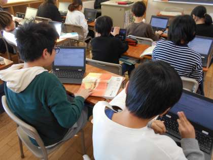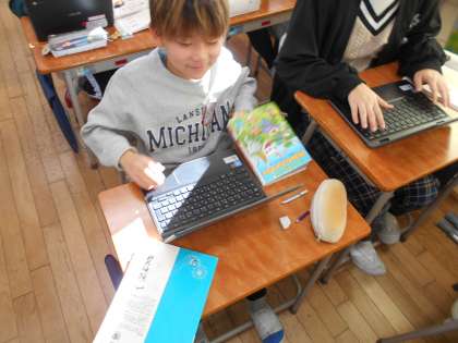本を紹介する対象を決め、その相手にあった表現の仕方を考えながら、自分のおすすめの本を紹介する文章を書く学習をしています。おおまかな構成を考え、クロムブックで下書きをし、内容を吟味していました。