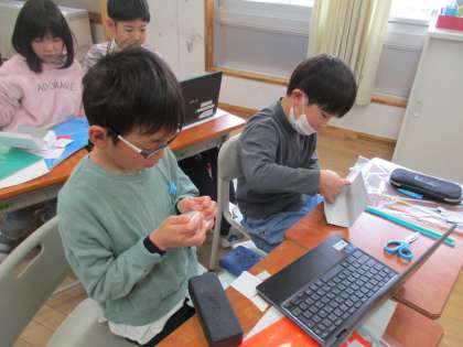 図工の時間では、ストローを使って動きのある作品を作ろうと活動を進めています。ストローの動きを利用して、魚やイルカが泳ぐ姿を表したり、手を振る人を表したりなど工夫しています。ストロー独特の動きの特徴を理解しながら、製作活動に取り組んでいます。