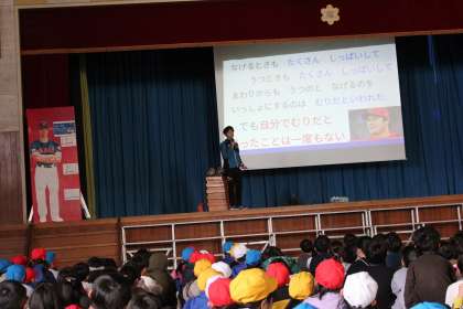 大谷選手からの夢のようなプレゼントのグローブが藤ノ木小学校に届き、全校で寄贈式を行いました。大谷選手の思いを聞いたり、6年生代表児童にキャッチボールをしてもらったりしました。子供たちは、目をきらきら輝かせながら見入っていました。「野球しようぜ」とメッセージ付きで送られてきたグローブ。各学年交代で使用していく予定です。