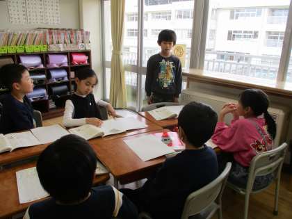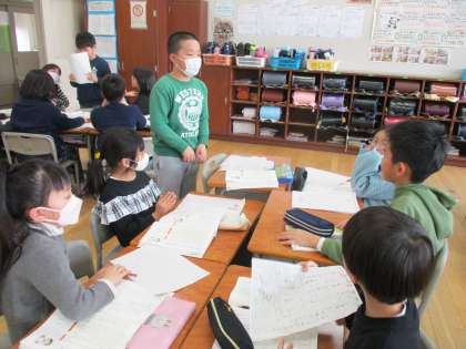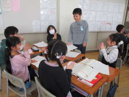 国語科の学習で、この1年間で心に残った思い出を文章で表しました。今日は、発表するときに気を付けることを確認した後、班の中で発表しました。友達の発表を聞き、「友達が考えていることがよく分かった」「笑顔で発表している友達を見て、自分も楽しい気持ちになった」と感想を述べ合いました。