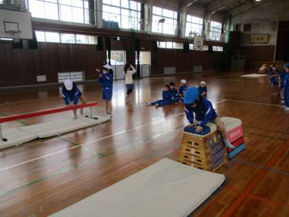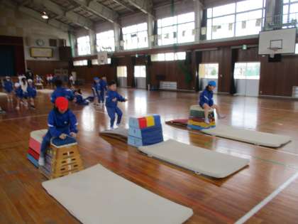体育の学習では、「跳び箱遊び」に取り組んでいます。跳び箱が2つ並んでいるコースや、平均台のコースなど、用意されたさまざまなコースを楽しく跳んでいます。