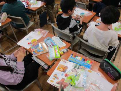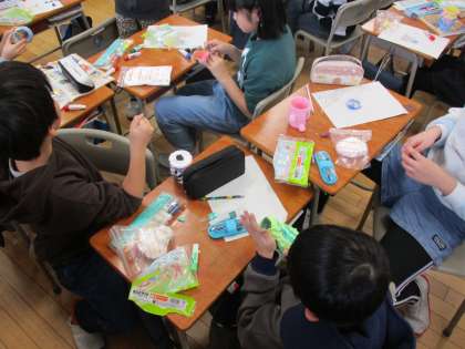 図画工作科では、「空き容器のへんしん」に取り組んでいます。白い粘土に絵の具を混ぜ込んで色を付け、容器に付け、少しずつ変身させていきました。完成が楽しみです。