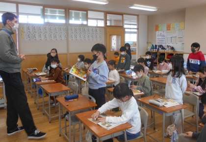「Who are you?」 の学習では、グループで短い話を分担し、発表するための練習をしました。動物役の振付も考えて、友達の発音を聞いたり自分の役で話したりしました。