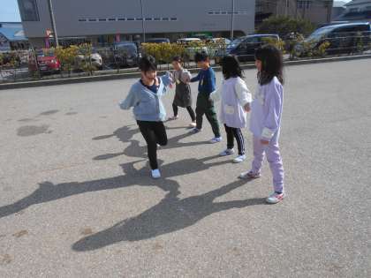 かげを重ねたり、並べたりしてかげ遊びをしました。大陽が雲に隠れるとかげが薄くなることに気づき、晴れ間を狙って楽しみました。