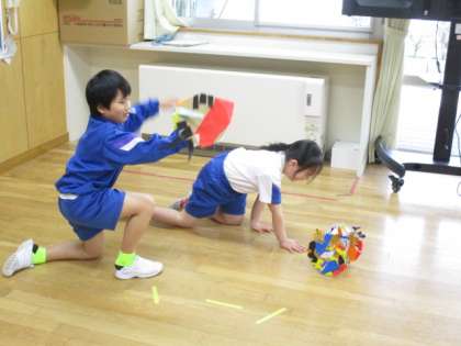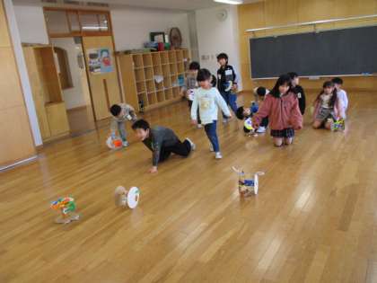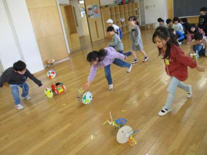 図画工作科「かみざらコロコロ」で作った作品を転がして遊びました。飾りの付け方で回り方が違い、お互いに見合いっこをしたり、友達と一緒に転がしたりして楽しみました。