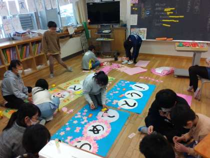 卒業生へのお祝いを伝えるために、壁面づくりやプレゼントづくりに取り組んでいます。みんなで協力し合いながら、制作しています。