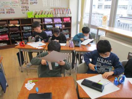 身の回りにある箱の、面の数や形を確認したあと、実際に箱を組み立ててみました。そして、面をどのように並べれば、箱ができあがるのかといろいろな並べ方を試しました。