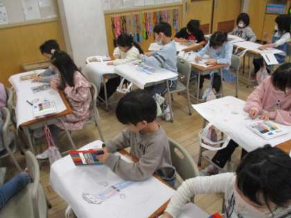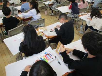 図画工作科で描いた絵等を持ち帰るための手さげに絵をかきました。自分の好きな絵や模様を描いて楽しみました。