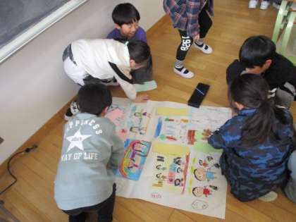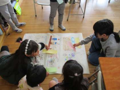 生活科「もうすぐ2年生」の学習では、来年度入学する1年生に1年生の学習について伝えようと絵や文でまとめています。「漢字はまだ読めないから平仮名で書こう」などと新入生を思い浮かべながら友達と協力して取り組んでいます。