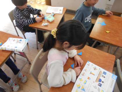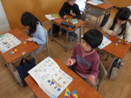 算数の授業では、色板や数え棒を使っていろいろな形を作ることを楽しんでいます。一人で考えたり、友達が作った形を参考にしたりと、好きな形を自由に作りました。