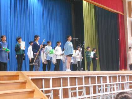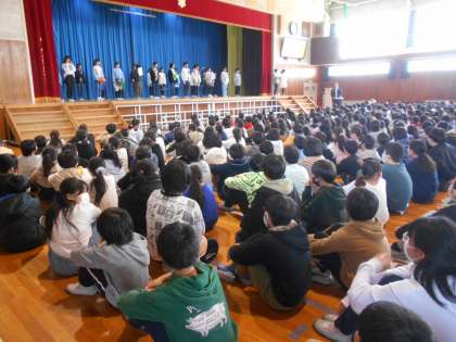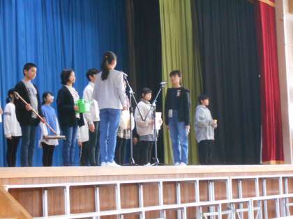 児童会引き継ぎ式では、今年度の委員長が活動内容や来年度に向けての思いを話し、来年度の委員長に引き継ぎました。5年生は、6年生の皆さんから教えていただいたことを大切にし、来年度の委員会も頑張っていきたいと意欲を高めました。
