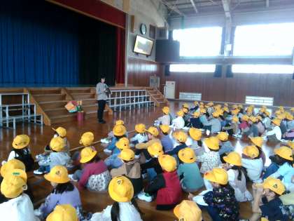 1年生全員で体育館に集まり、簡単な学年集会を行いました。それぞれの担任の先生の紹介や下校コースの確認を行いました。子供たちは、静かに話を聞こうとがんばっていました。