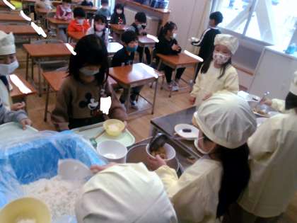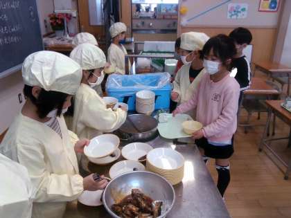 当番の子供たちは、初めてにもかかわらず手際よく盛り付けていました。みんなで協力しておいしい給食をいただきました。