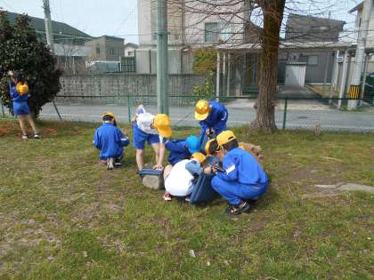 春の生き物を探しに行きました。桜やタンポポやつくしなど色々な植物を見つけることができ、子どもたちはウキウキしながら活動していました。