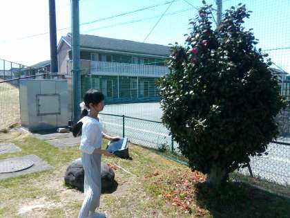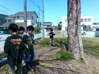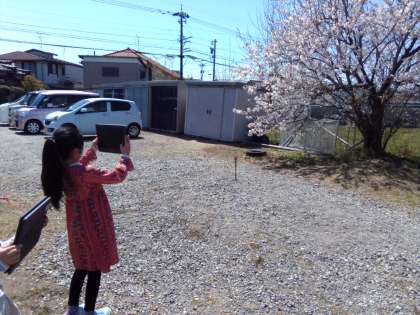グラウンドで花や木などの植物を観察しました。「前より緑が増えた」「花が咲いている木とそうでない木がある」など、春の植物の様子から気付いたことをたくさん見付けていました。