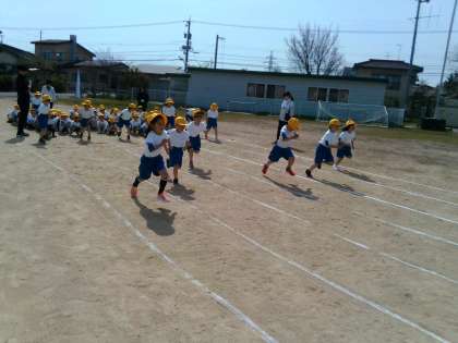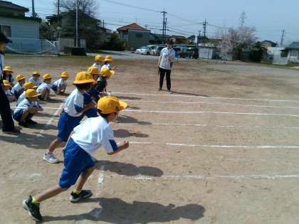 初めての体育の学習を行いました。グラウンドで50mを走りました。コースに沿ってまっすぐ一生懸命走りました。
