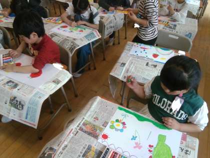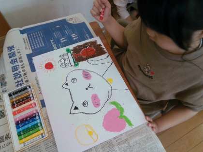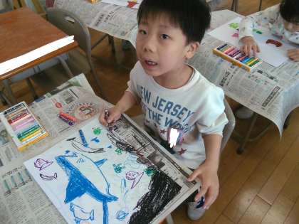 図画工作科「すきなものなあに」の学習では、自分の好きなものを画用紙に描きました。好きな動物や食べ物等、のびのびとクレヨンで描き表しました。