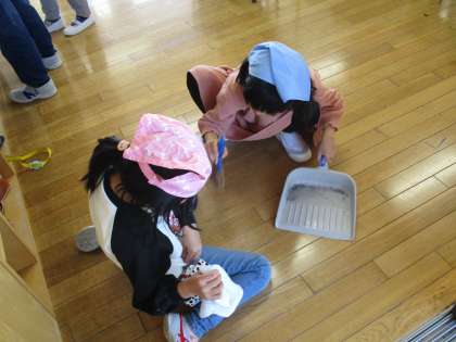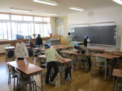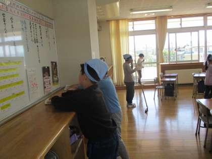 清掃活動もはりきって行っています。子供たちは、清掃時間になると自分の担当箇所を黙々と掃除しています。教室掃除では、子供たちにとっては重い机を一生懸命運んでいる姿がとてもほほえましいです。
