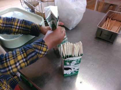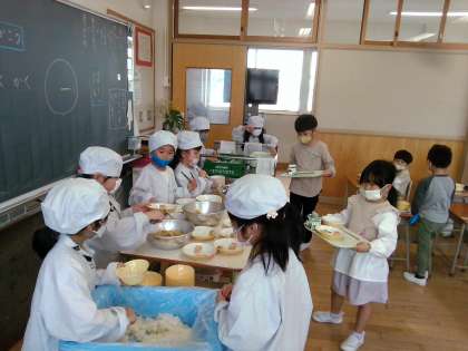 給食当番の仕事にも慣れてきました。おいしく食べて、片付けもきちんとできています。
