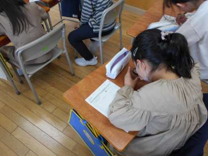 色・形・大きさを記録し、種の絵を描きました。虫眼鏡で表面を観察していると、「黄色が見える」や「ごつごつしている」など、子供たちは新しい発見をしていました。