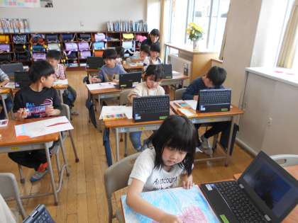 図画工作科では、自分が春だなと感じるものを絵に表しています。先日、グラウンドで春見付けをして、クロムブックで写真を撮りました。子供たちは、写真を見ながら、その景色を見たときのことを思い出し、いろいろな色や形で表していました。