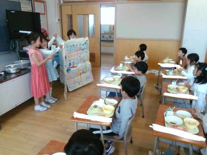 給食の時間に2年生さんが一年間の活動や学習を紹介しに来てくれました。