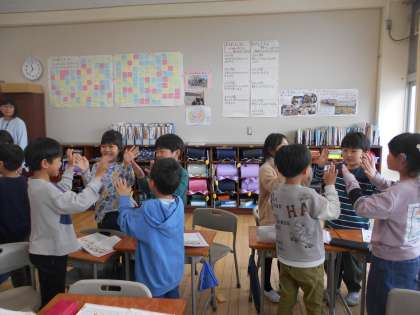 音楽科の学習では、手拍子や足踏みをしながらたくさん歌っています。今日は、2拍子の曲を歌いました。グループで円になって手拍子をして、拍のまとまりを感じました。子供たちはとても楽しそうで、笑顔が溢れていました。